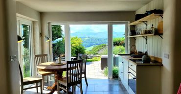 The kitchen has French limestone tiles with under floor heating, fridge, kettle, cooker and toaster. Dine with stunning views of the Carneddau mount range or step through the French doors onto the west facing terrace that gets the sun all day.