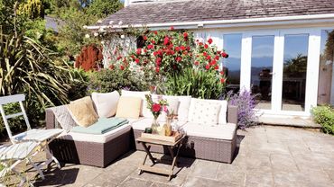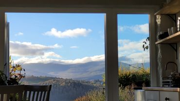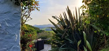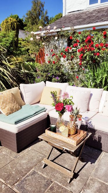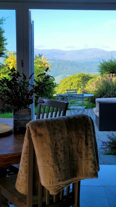 The terrace enjoys sofa seating, bistro table, table and benches looking out over the patch work fields and rolling hills of the valley and Snowdonia beyond.