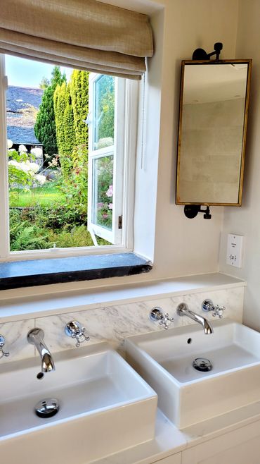 A bathroom with underfloor heating and a loo with a view, bath, shower and twin sinks.